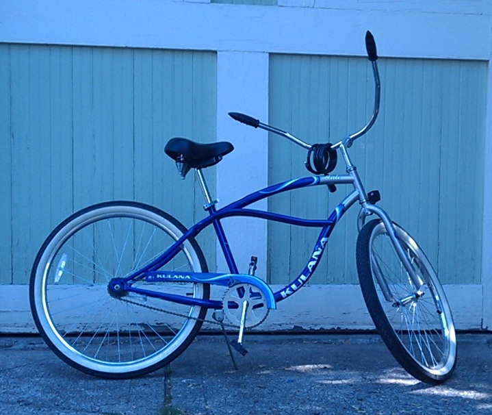 Who wouldn’t covet my smooth park ride? It is a 2005 Kulana Huli one-speed cruiser. It is substantial at 40 or 50 pounds. Its sweeping handle bars stretch back nearly to the wide, sofa-like seat where yesterday I lounged in my unraveling Levi’s 501 cutoffs. My garden Crocs fit perfectly on the giant rubber pedals and last night the out-of-round white wall tires made a happy buzz on the asphalt as we lumbered around the park loop.