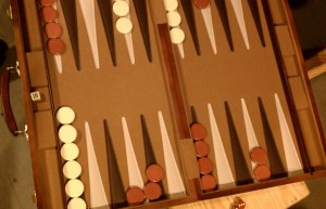 The Spouse learned to play backgammon in the summer of 1989 on the giant screened porch attached to the back of the Parents big old South Jersey Victorian. Two Brothers and I were home that summer (Younger and Older. Oldest lived elsewhere by then.) and we played backgammon a lot. Hours of evening backgammon while hungry bugs worked at the screens, desperate for our blood. Older Brother was almost unbeatable. Younger Brother played indifferently. If the Spouse wanted to spend any time with me, he had to learn backgammon. I think he learned about Funks and Doubles in his first game.