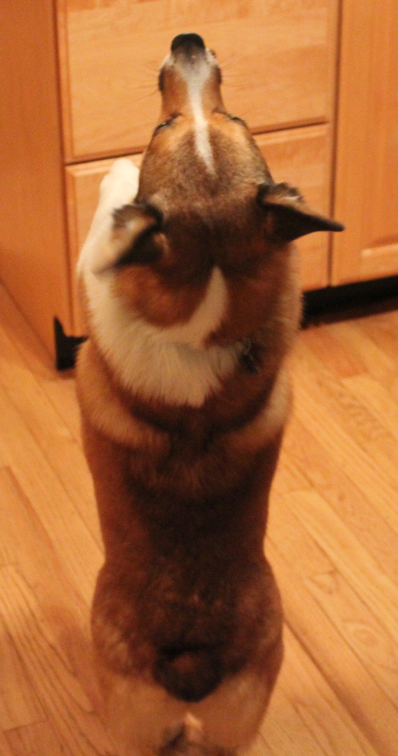 Miss Tibbit tried to walk like a man, but instead she jumped 5 feet in the air and snatched a treat out of my hand. She sat. She stayed. She went into a down. “This is it,” I told her and tossed the last snack.