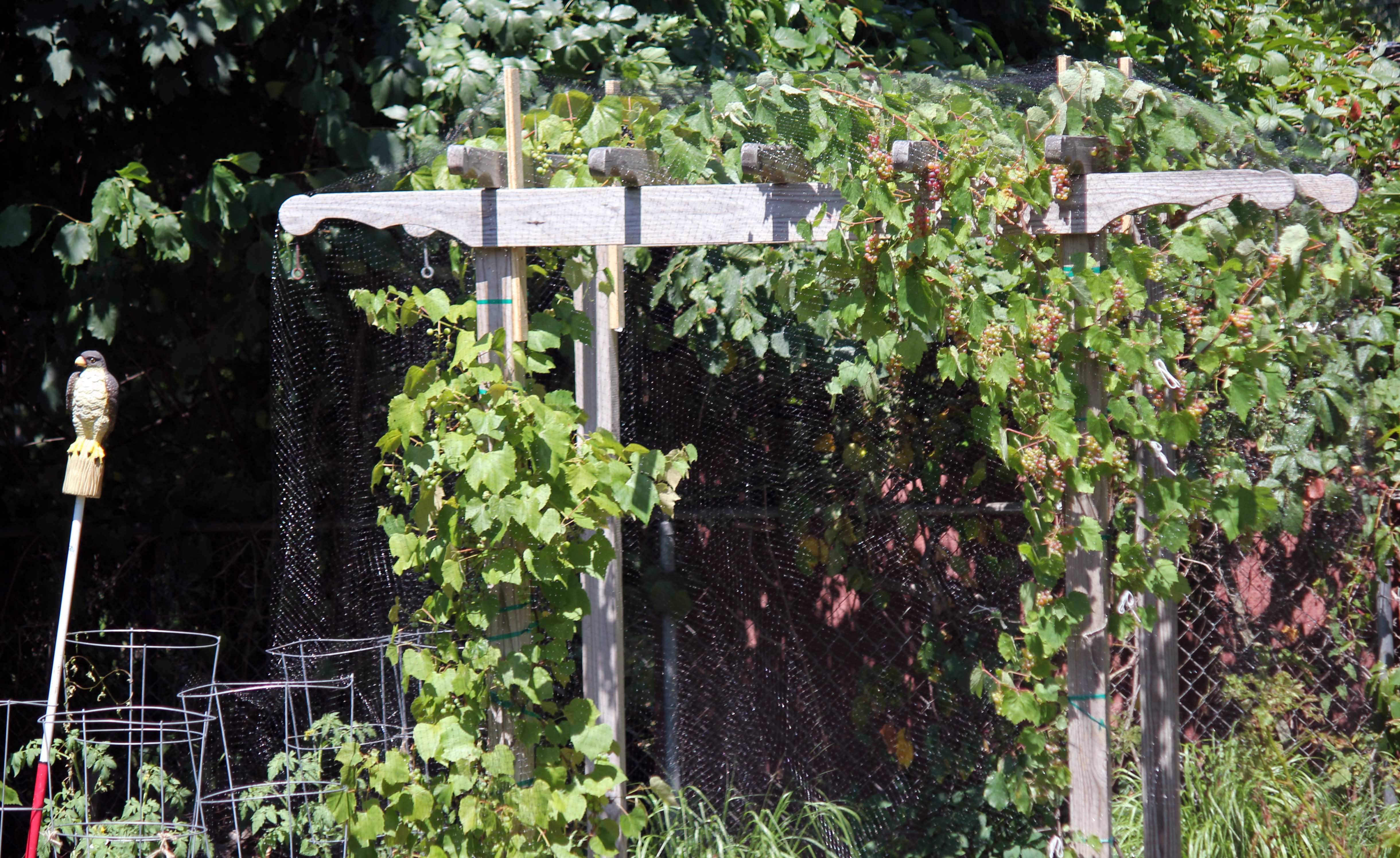 Today the vile garden thieves circle the arbor, cheeping tactical data to one another.  The netting wafts in the airy day, effective still. Wish us luck Friends, as we guard our precious grapes.
