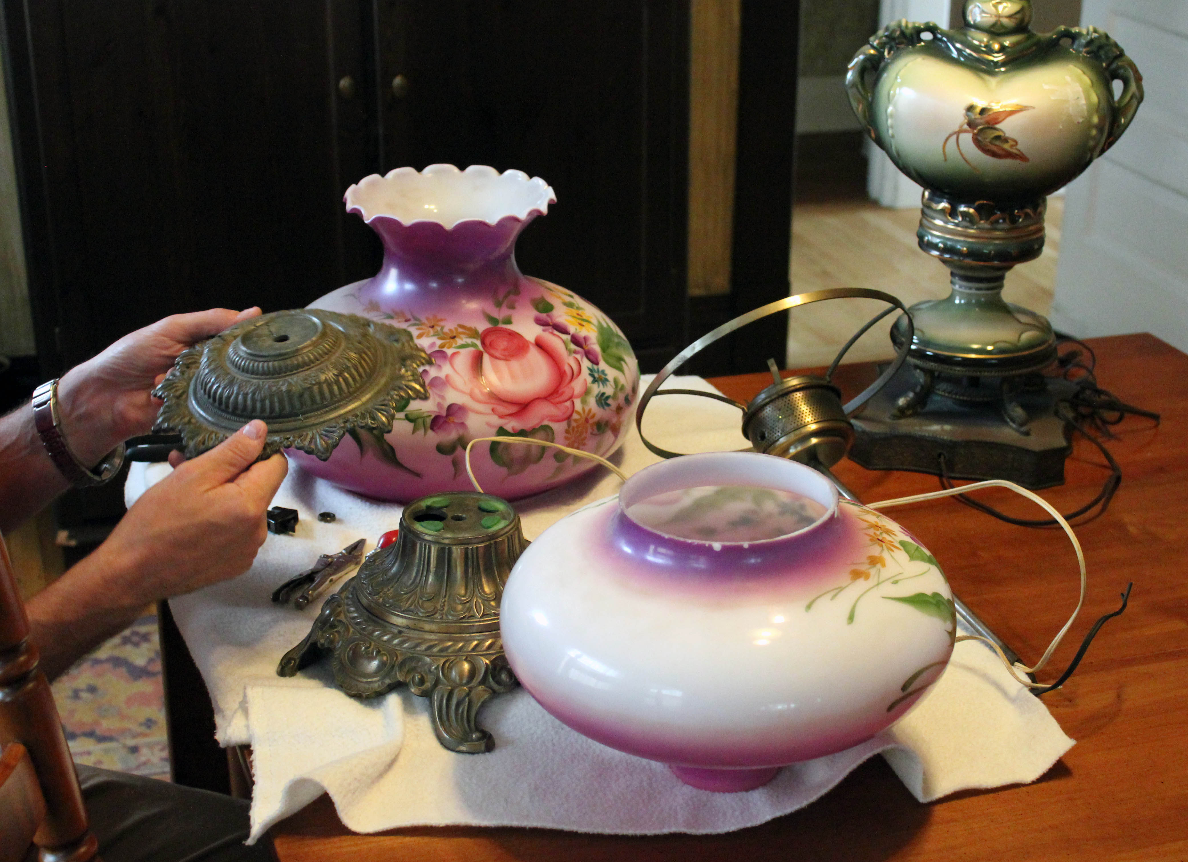 My new lamp has wee tiny koi fish as feet and the paint work is chipping a little bit. It might be a 1960s tv guide, limited edition kind of a lamp. It is sort of grotesque. The Spouse’s new lamp is a monstrous purple thing with hand painted flowers. It seems to be a Frankenstein, actually DESIGNED as a mash – maybe as some kind of post-war quickie production. Repurposed oil lamp parts, similarly designed cast metal pieces, sketchy wiring, giant glass globes, and decades of filth battle it out for most repugnant aspect. The red Christmas bulb in the base portion gave the thing a repulsive faux-Victorian, bordello glow. “Oh man, that’s something,” I said when the Spouse flicked it on – bravely flicked it on because the wiring was exposed through ancient electrical tape.